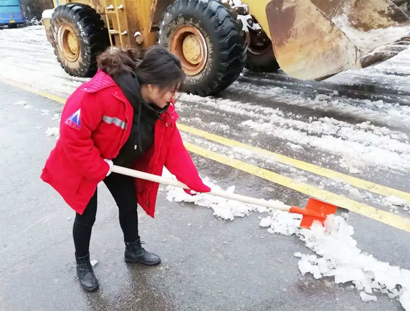 有想法就付諸于行動,簡短交流后,員工們開始有效的分工安排,開裝載機(jī)、拿鐵鍬、用掃帚、撒工業(yè)鹽、保障物資等,默契合作。